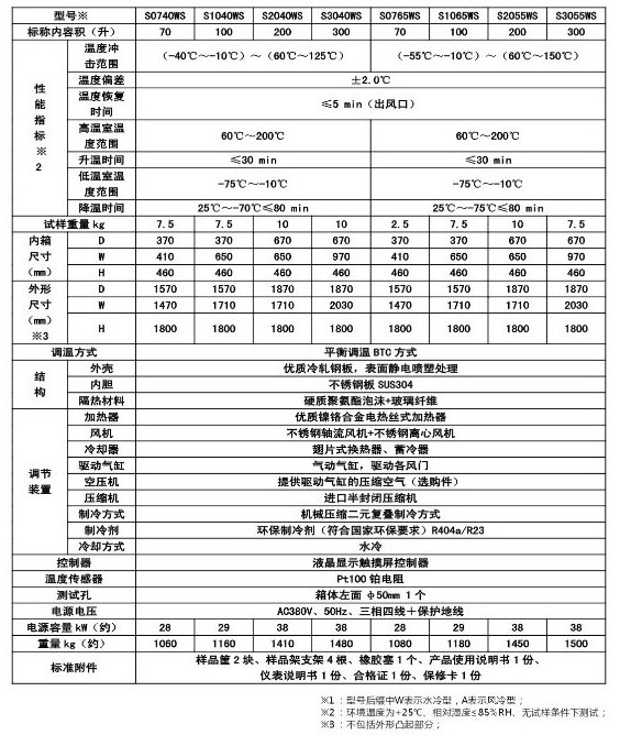 MC028系列溫度沖擊試驗(yàn)箱  一、產(chǎn)品簡(jiǎn)介 用途:適用于對(duì)電工、電子和其他軍用設(shè)備在周圍大氣溫度急劇變化條件下的適應(yīng)性試驗(yàn)。 特點(diǎn): 1.充分吸收國(guó)外同類產(chǎn)品的優(yōu)點(diǎn),采用兩箱式上下結(jié)構(gòu),上箱體為高溫箱,下箱體為低溫箱。也可根據(jù)用戶要求設(shè)計(jì),制造左、右結(jié)構(gòu)的兩箱式溫度沖擊試驗(yàn)箱。也可以根據(jù)用戶要求采用單相式(或三箱式)結(jié)構(gòu)設(shè)計(jì)。 2.觸摸屏+PLC可編程邏輯控制器,RS485接口。 3.有工作室超溫、壓縮機(jī)過(guò)載、超壓、油壓超壓、風(fēng)機(jī)過(guò)載、缺相、壓縮機(jī)延時(shí)等保護(hù)功能,還有若干用戶選配的安全保護(hù)功能,如風(fēng)速過(guò)低,大門(mén)未關(guān)閉等等。 4.可選配遠(yuǎn)程監(jiān)控計(jì)算機(jī)及軟件,上位機(jī)實(shí)行冗余設(shè)計(jì),可連接PC電腦,也可連接觸摸屏控制器。上位機(jī)關(guān)機(jī)不影響系統(tǒng)控制。 二、技術(shù)參數(shù):